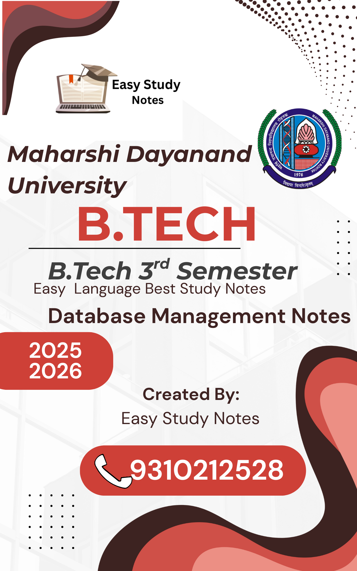 Understanding Database Management Notes (DBMS) can be challenging due to complex reactions, mathematical concepts, and detailed diagrams. To make it easier for students, Easy Study Notes brings you the most complete, clean, and exam-ready Database Management Notes PDF for B.Tech 3rd Semester.